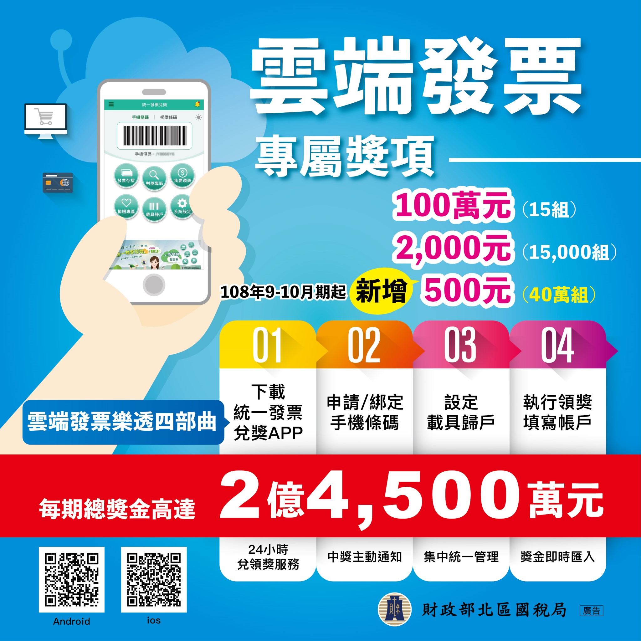 下載統一發票兌獎app: 掃描上面的qrcode,或於google play商店、ios app store搜尋「統一發票兌獎」(請認明有財政部logo的,才是正宗的統一發票兌獎app)。. | 景點 | 統一發票11~12月 | 統一發票9~10月 | 統一發票7~8月 | 統一發票5~6月 | 統一發票3~4月 | 統一發票1~2月 |. 發票開獎時間 發票中獎清冊 發票領獎地點 發票歷史號碼 扣稅實領金額 載具申請 雲端發票. 統一發票 3、4 月中獎號碼出爐囉!股感的讀者朋友們,快拿出手中的發票對一下號碼,看看自己是否有中獎?除了第一手的兌獎訊息,股感還要教你「如何領獎」、「 雲端發票 專屬千元獎」去哪換?另外,現在很多人都把發票存在載具中(也就是所謂 雲端發票),但如果你的雲端發票/載具 中獎. 「發票存摺 + 統一發票對獎機」是一款免費的手機應用程式,支援 ios 和 android,主要有雲端發票和統一發票自動對獎功能,相較於手動去對每張發票後三碼來說統一發票對獎機速度更快,只要掃過就會跟你說有沒有中獎,也能將最後結果統整出來分享到社群網站。